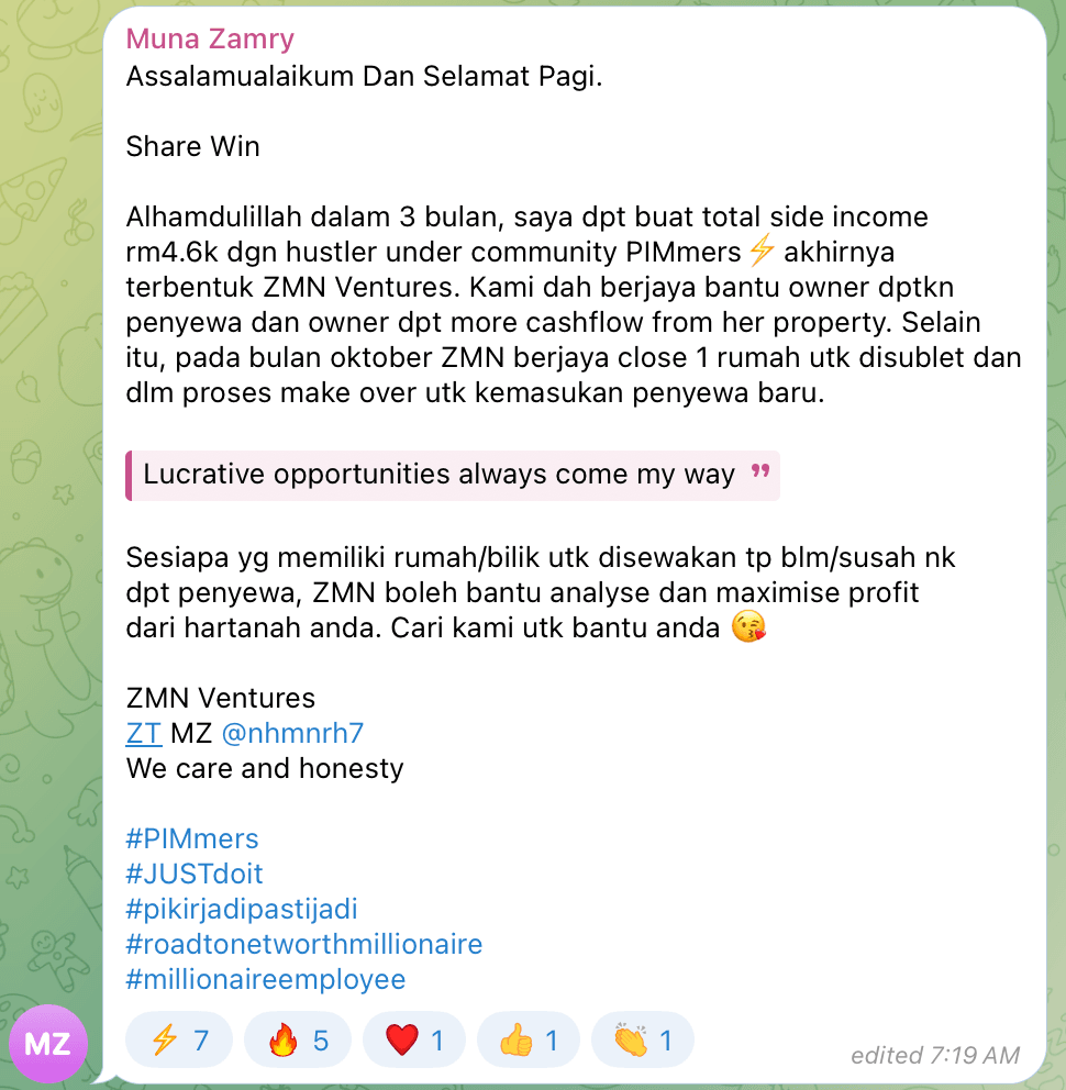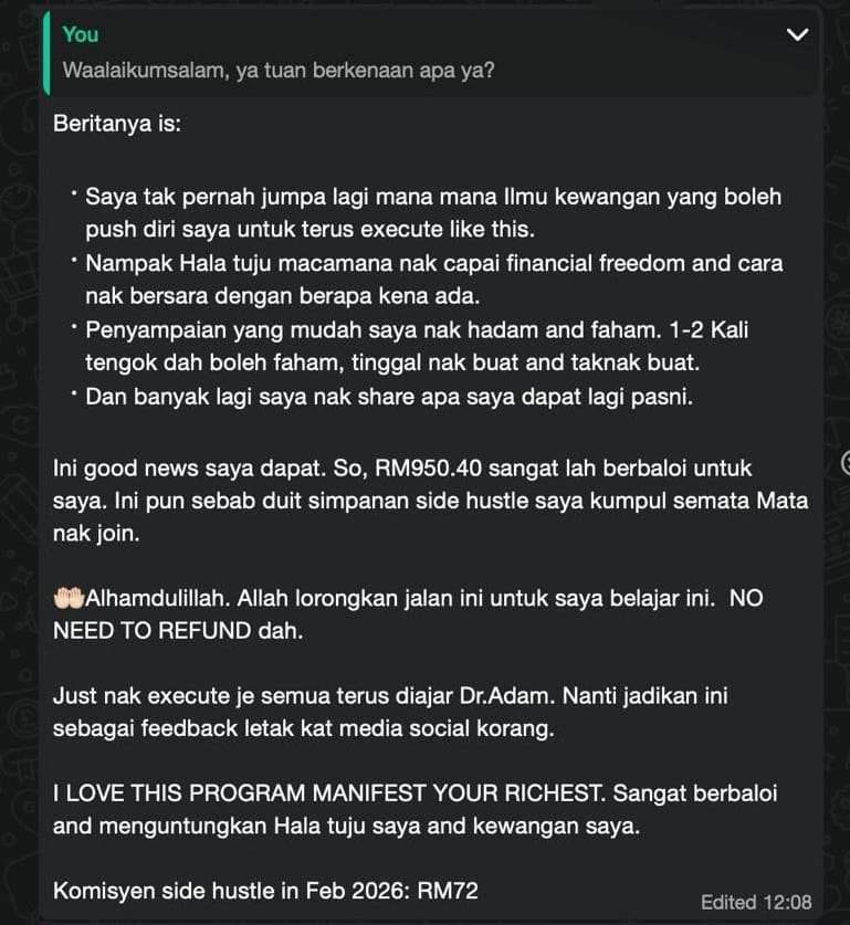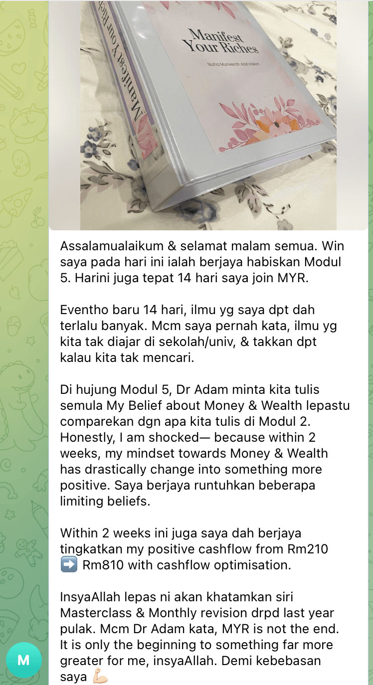 • Grand Bonus: Akses 12 Bulan Ke Telegram Komuniti Manifest Your Riches (PRICELESS)