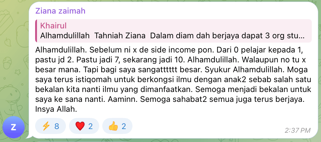 “Sebelum ni tak de income pon. Dari 0 pelajar kepada 1, pastu jadi 2. Pastu jadi 7, sekarang jadi 10. Alhamdulillah.” – Ziana
